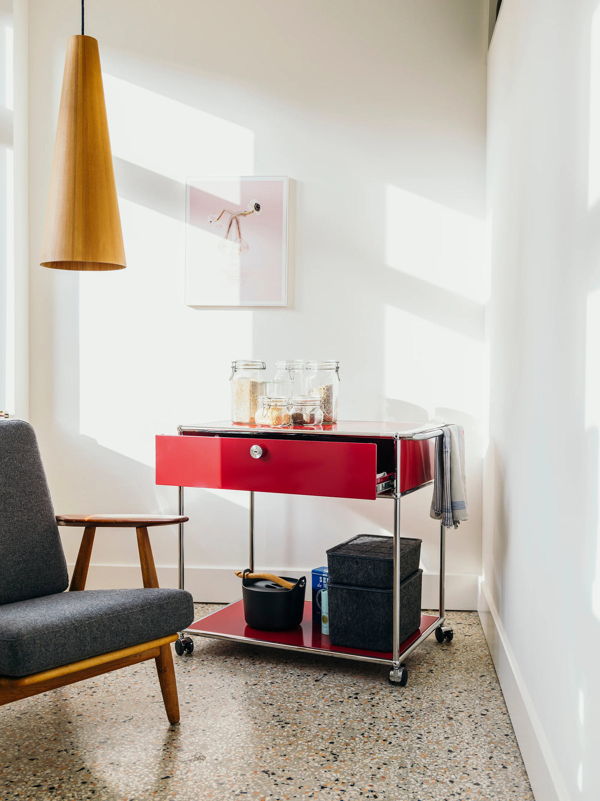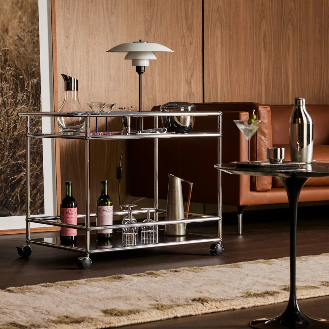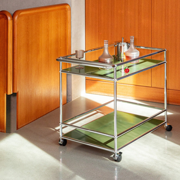 This modern serving cart offers plenty of space for all your entertaining needs. Designed with a handle and casters for easy mobility.  Available in 14 standard surface colors.